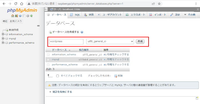 http://[ラズベリーパイのホスト名]/phpmyadmin/で起動し、データーベース名 wordpress を utf8_general_ci で作成します。