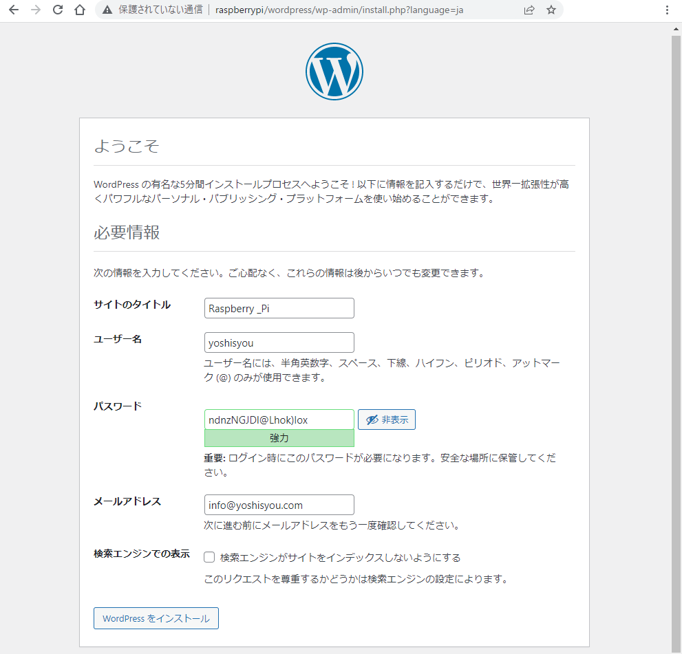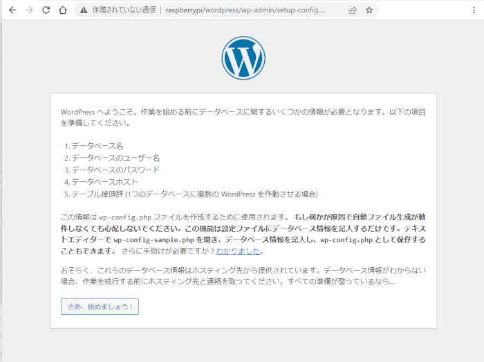 http://[ラズベリーパイのホスト名]/wordpressをWEBブラウザから呼び出せば、次のようにWordPressの初期画面が起動します。