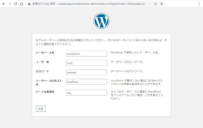 データベース名は、先ほど phpMyAdmin でwordpress を作成しました。別名で作成した場合はその名前にします。