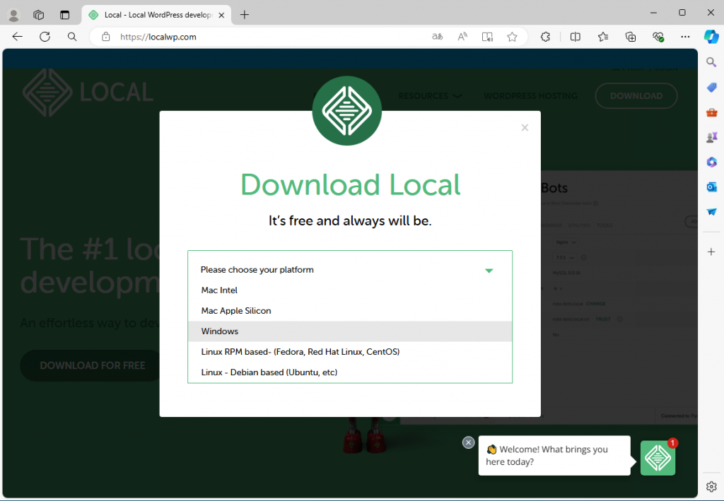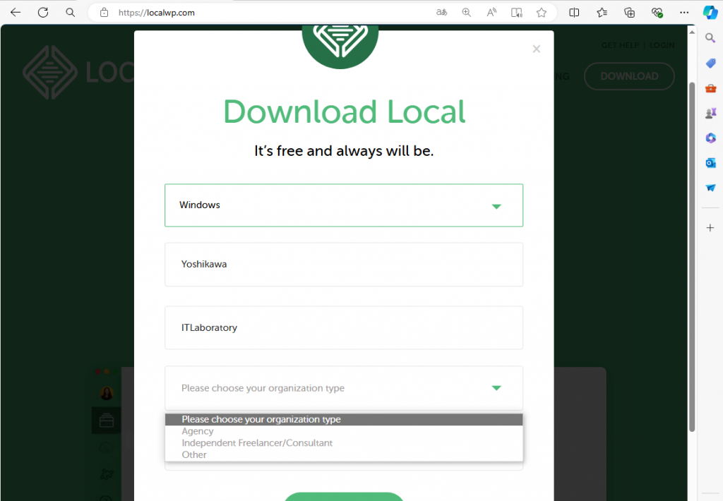 LocalWPの公式サイトからダウンロードします。ダウンロードページに移動し、「Windows」を選択します。