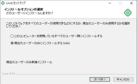 ダウンロードしたインストーラーを開き、表示されるオプションで「現在のユーザーのみにインストールする」を選択します。