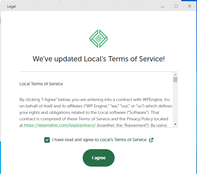 LocalWPを初めて起動すると、利用規約が表示されます。画面の下にあるチェックを入れて「I agree」を押します。