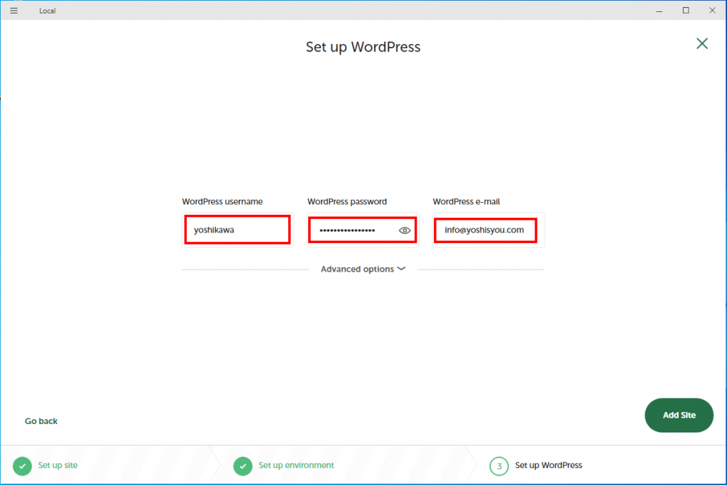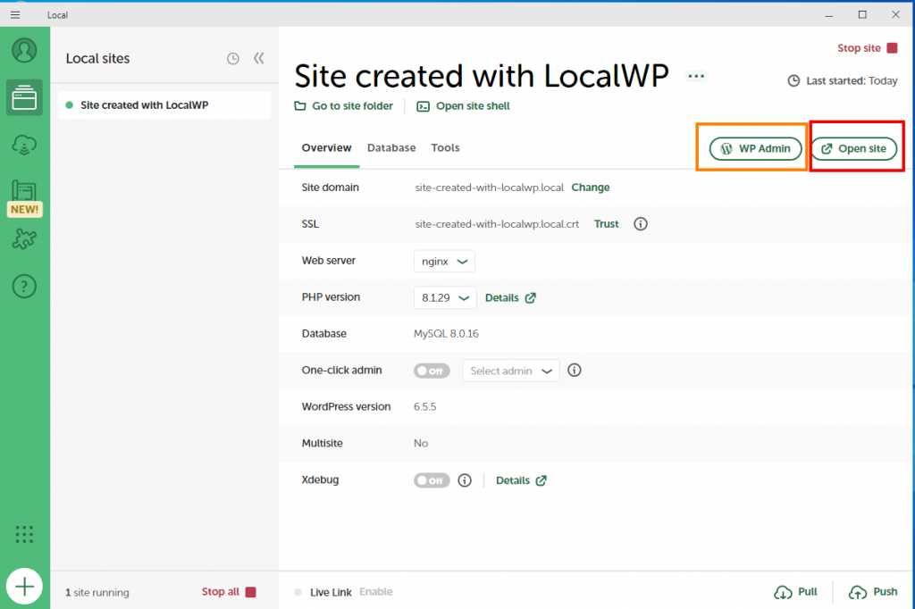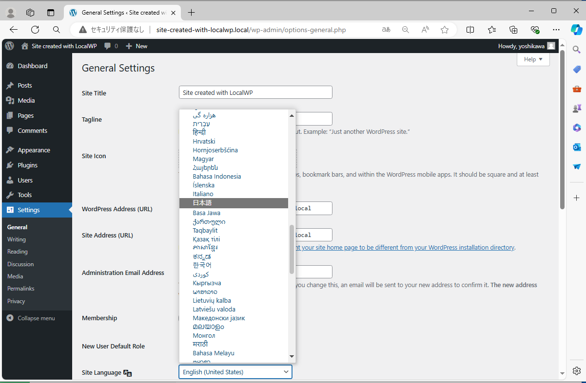 ここまでで、LocalWPによるローカル環境の構築が完了しました。
