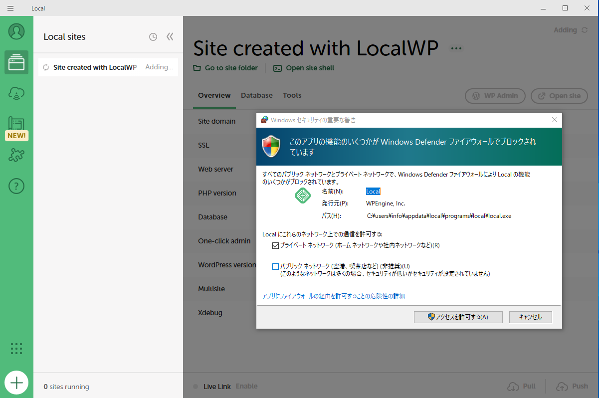 Local を終了してもよろしいですか?すべてのサイトがシャットダウンされます。