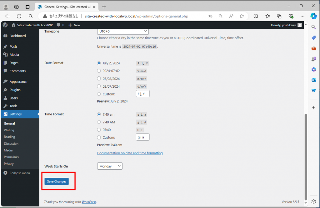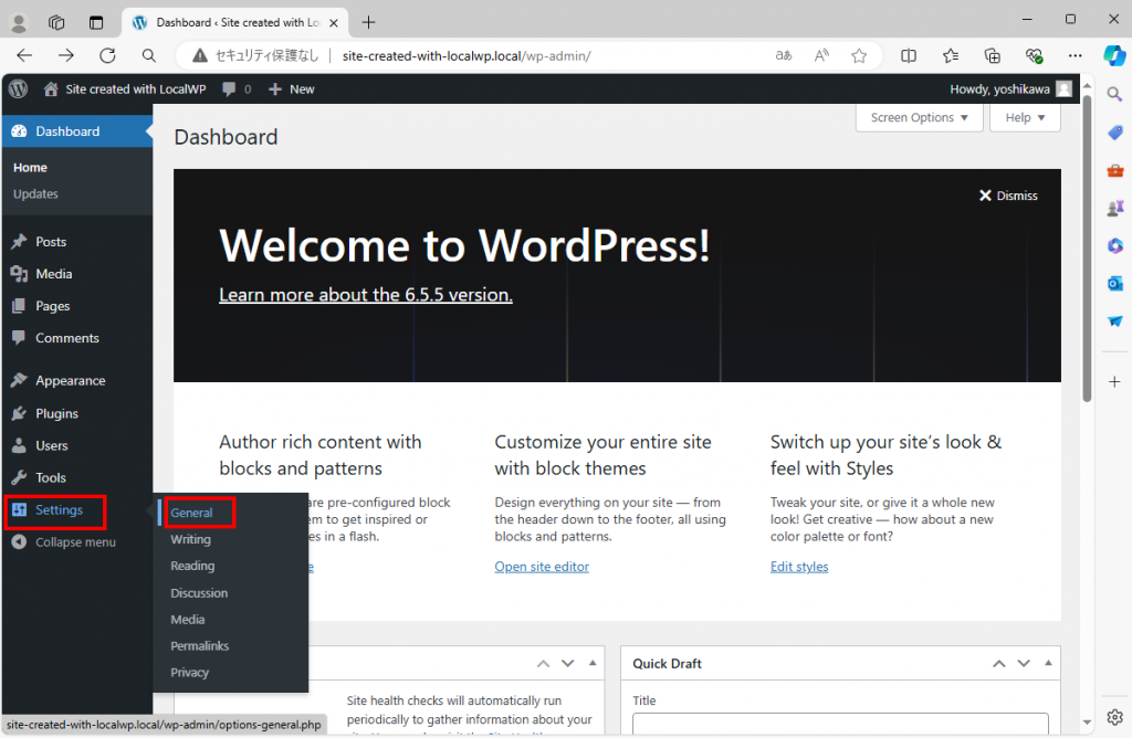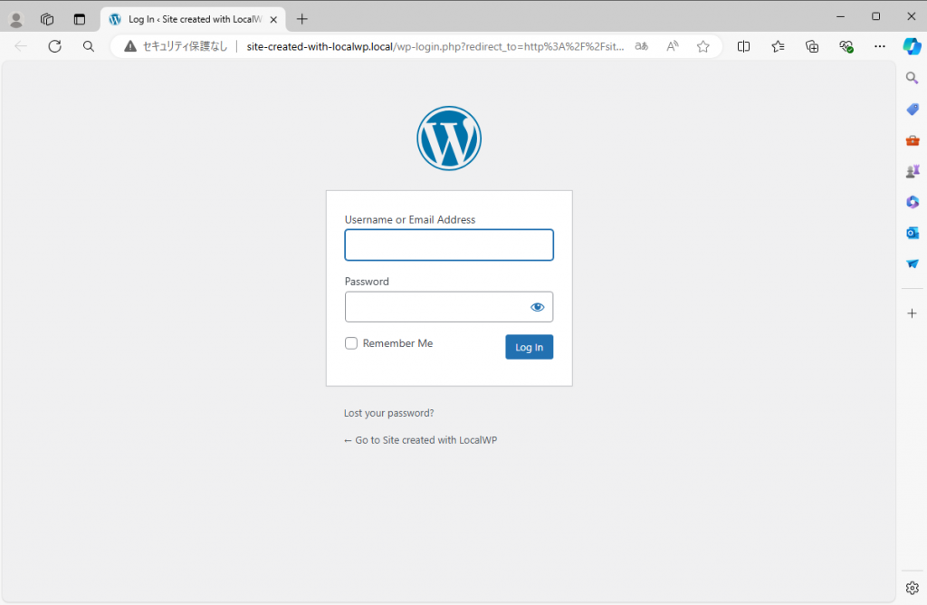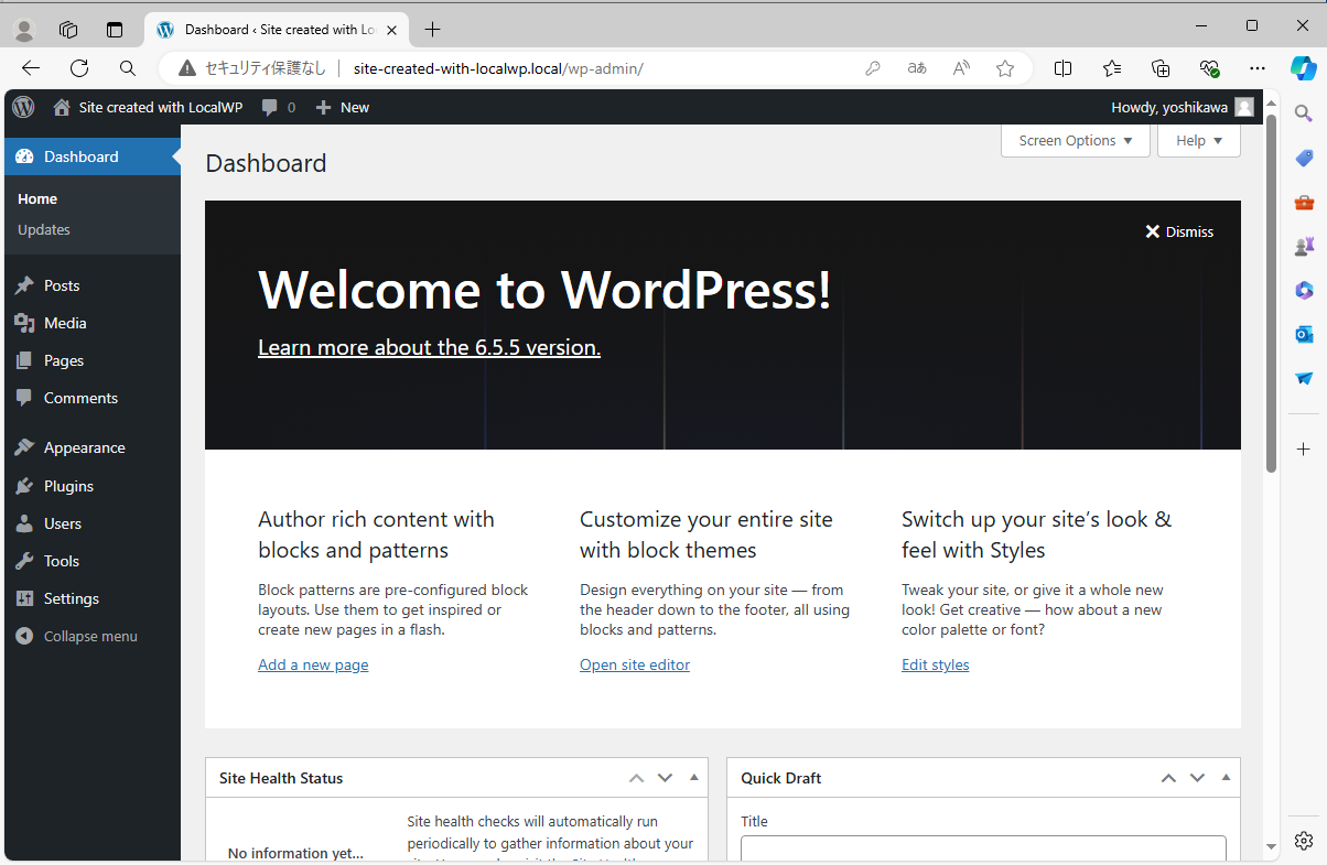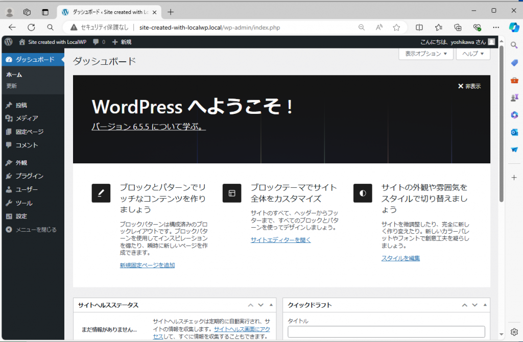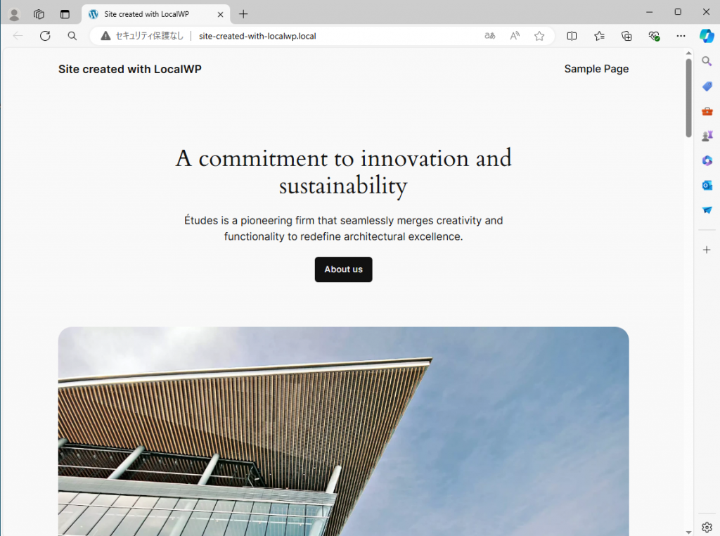 設定したサイト名 Site created with LocalWP がサイト名になっています。