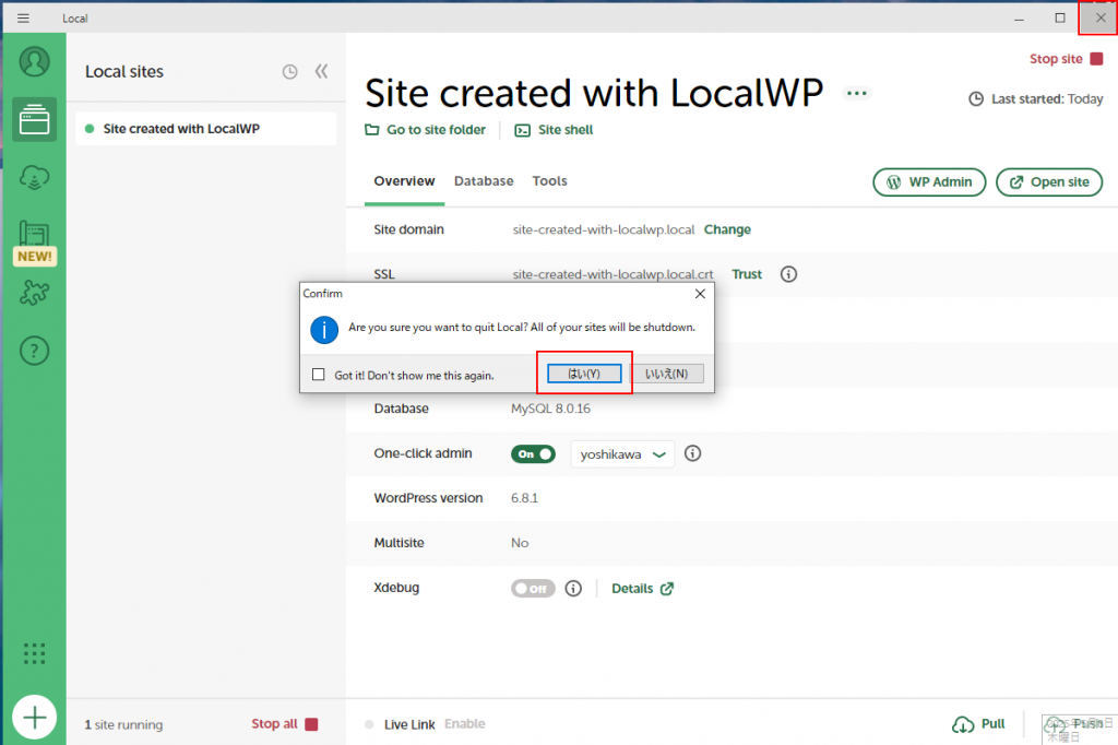 - 「はい(Y)」をクリックすると、起動中のローカルサイトがすべて停止し、LocalWPが終了します。