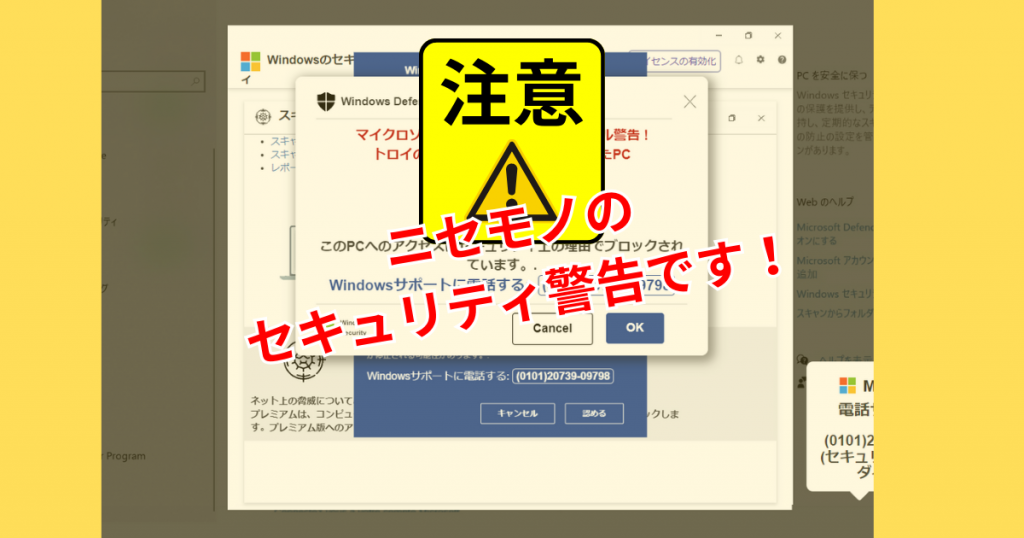 もし、実際にこのような画面になった場合、画面上のOKやキャンセルのボタンを押しても画面を閉じる事ができず、延々と警告メッセージが流れ続けるため、大変に不安になるかもしれません。