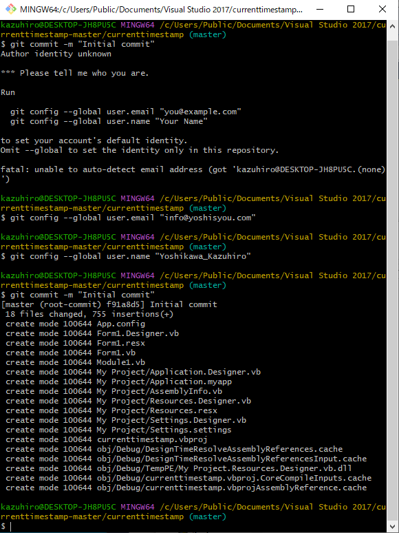 と入力しましたが、Author identity unknown とエラーになりました。