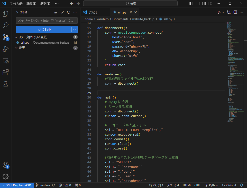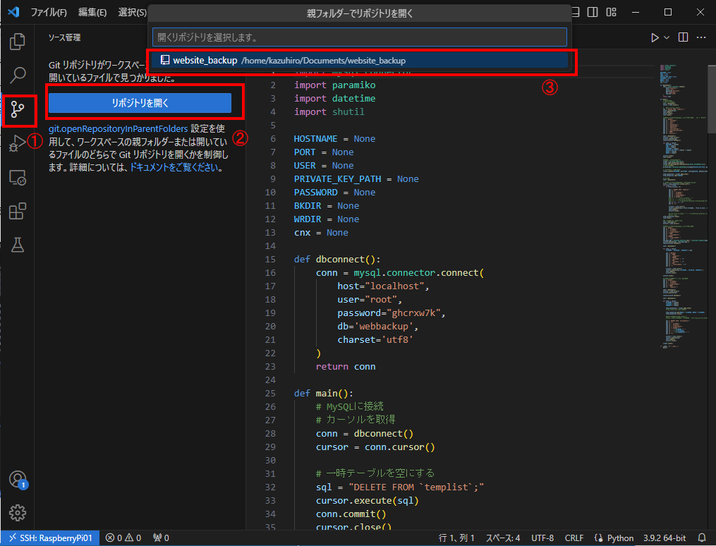 例として、Raspberry Pi上に作ったGitのあるディレクトリに、SSH接続して、pythonのファイルを開けてみましょう