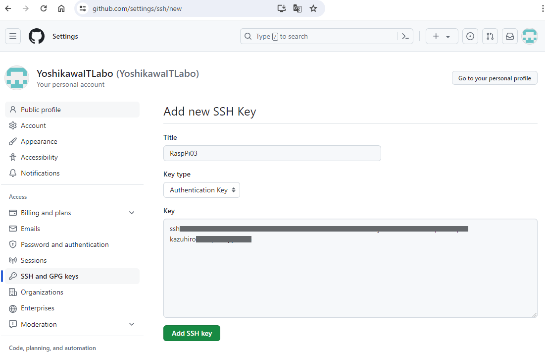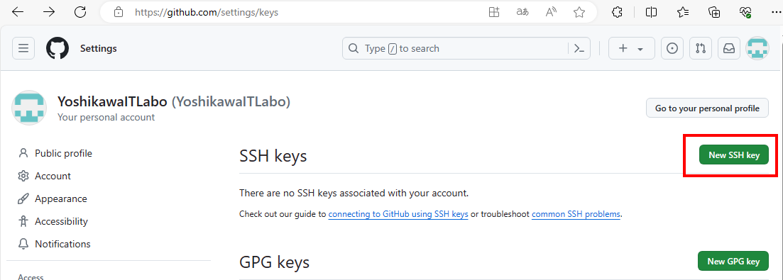 ログインできたGitHUB上で、https://github.com/settings/keys に接続します。