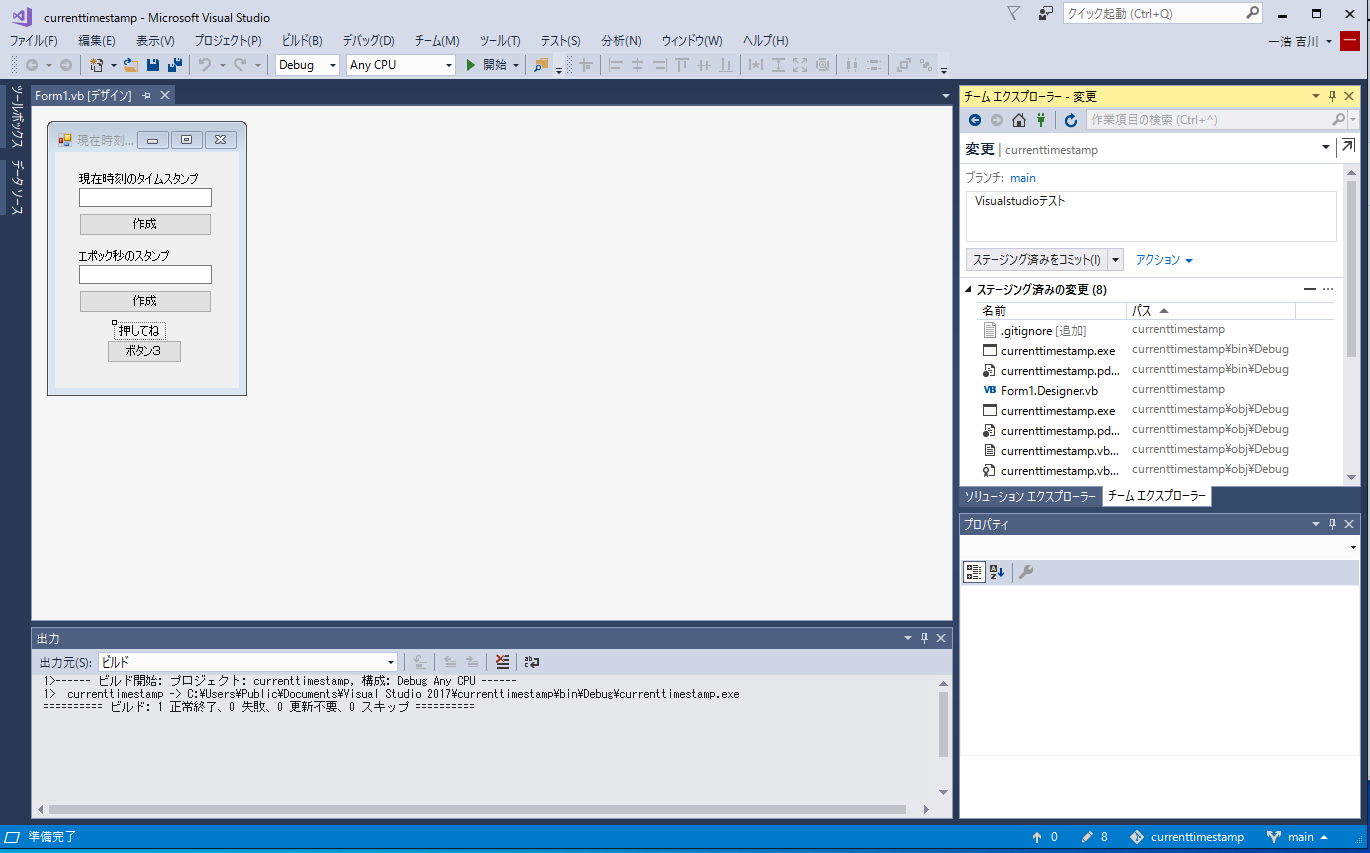 再び、チームエクスプローラーに切り換え、変更アイコンを押下すると、先ほどの変更とビルドで変更されたファイルがステージング済みの変更に表示されます。