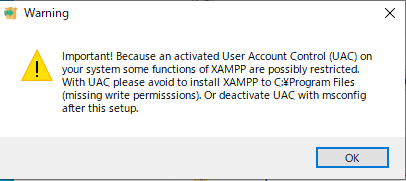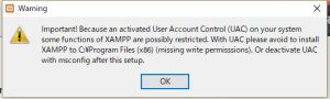 このため、通常、Windows 系のアプリケーションは、C:\Program Files 以下にインストールしますが、XAMPPはC:\Program Files にインストールすると機能制限されるので、UACを止めるか、場所を変える事で対応するように指示されるので、場所を変える方を選び、OKでスキップします。