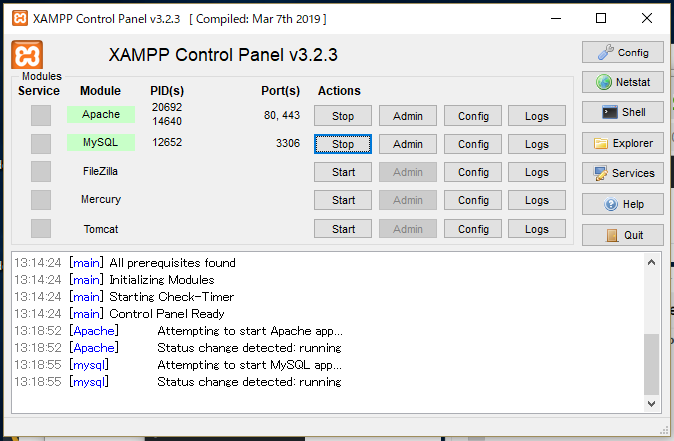 次に、XAMPPのコントロールパネルのStartボタンをクリックすると、機能が起動します。