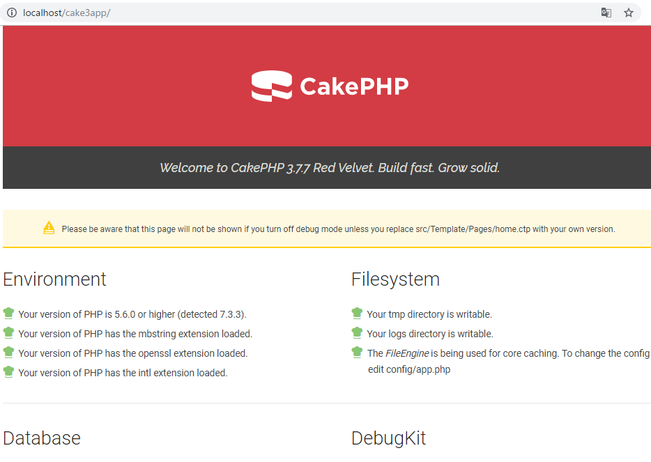インストールに成功したら、http://localhost/cake3app/ でCakePHPの画面が立ち上がります。