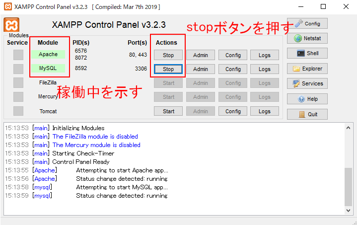 XAMPPコントロールパネルの操作