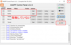 このStopボタンを操作しないまま、次のQuitボタンを操作すると、サーバー類は起動したまま終了してしまうので注意が必要です。