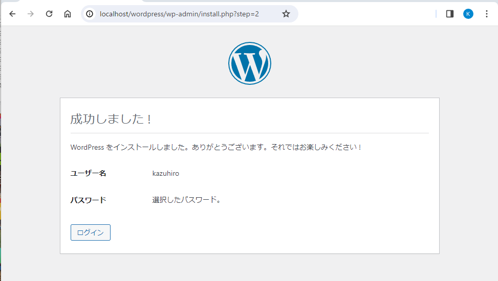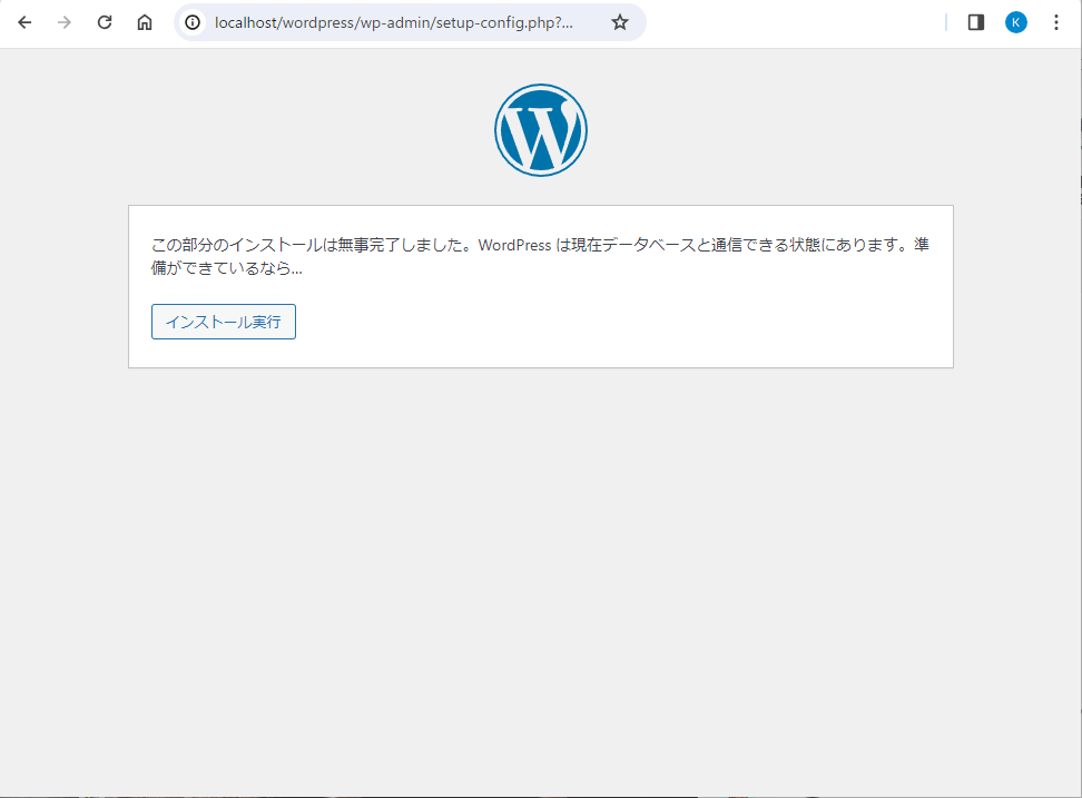 次に、localhost/wordpress をブラウザから呼び出せば、設定が開始されます。