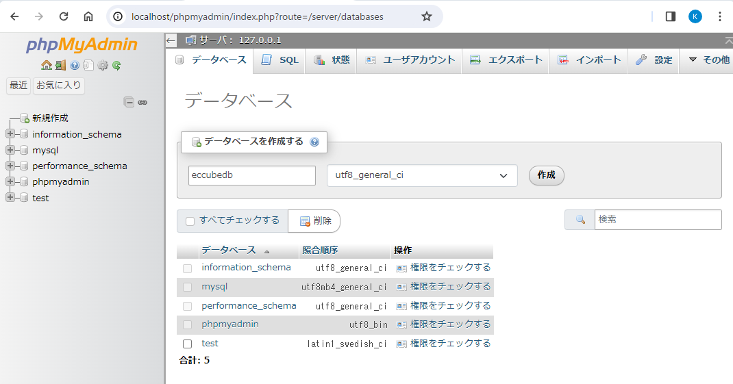 XAMPP環境なので、データベースは localhost
