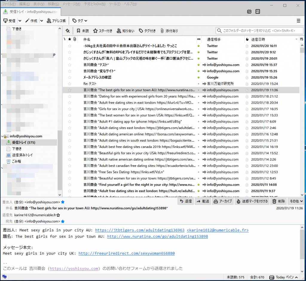 これは、当サイトのメールアドレスをThunderbirdで受信した画面です。