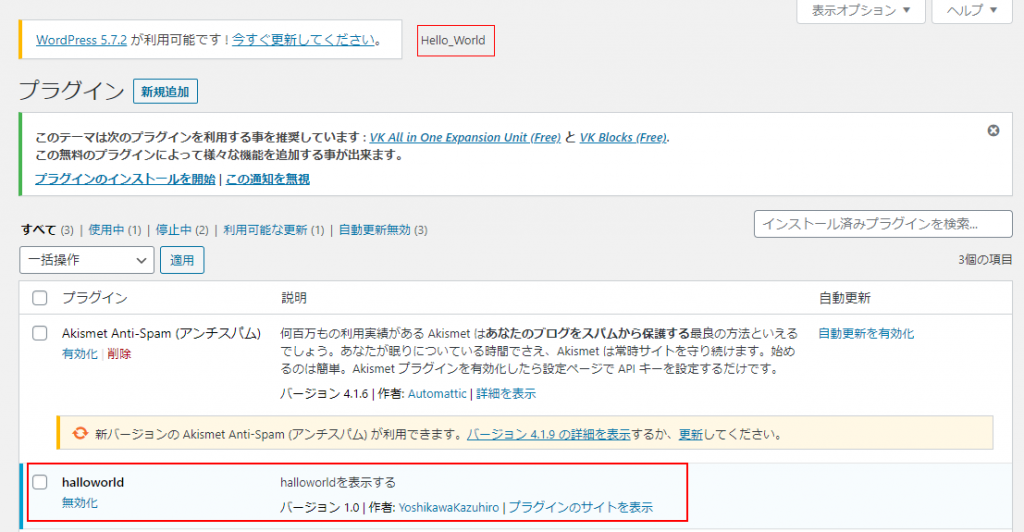 すると、このように管理ページの上に Hello_World と表示されるようになります。