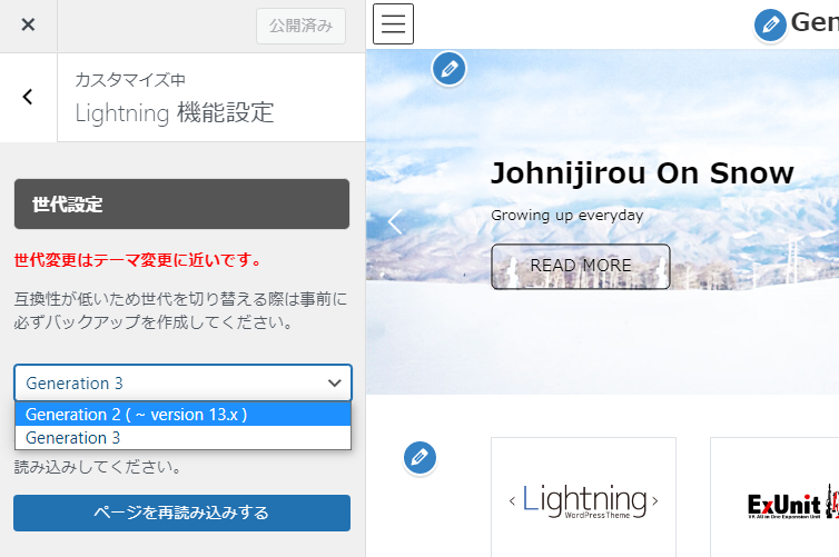 この場合、lightning機能設定を、Generation2にすると、子テーマが正常に動作するようになります。